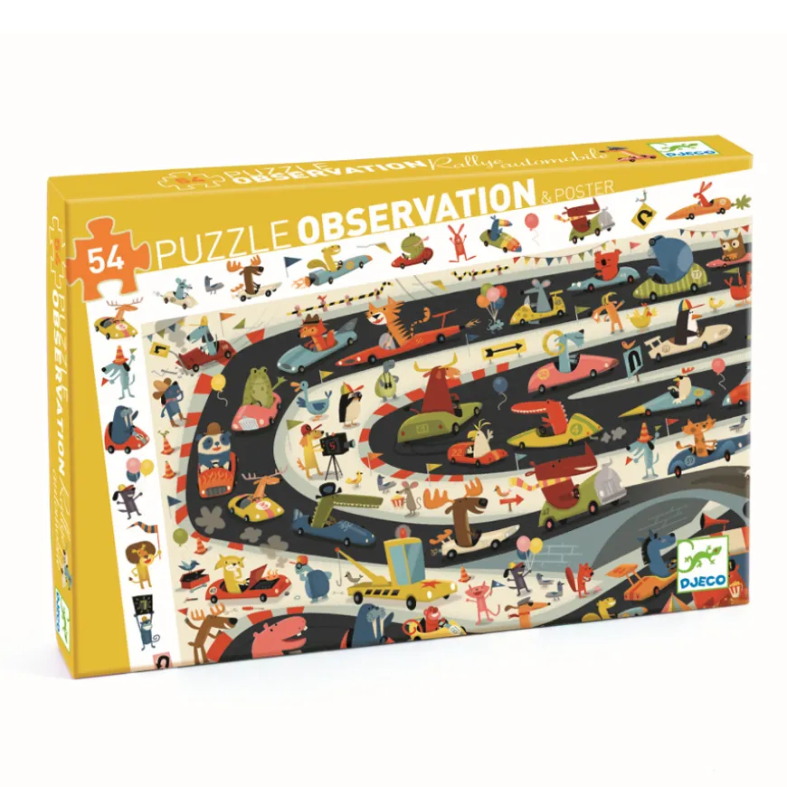 Auf dem Djeco Wimmelpuzzle Auto Ralley 54 Teile ist die Party in vollem Gange. Sportliche Wagen und fröhliche Tiere verleihen dem Djeco Puzzle eine unverwechselbare Note. Nun gilt es, Schritt für Schritt die passenden Teile zusammenzulegen!