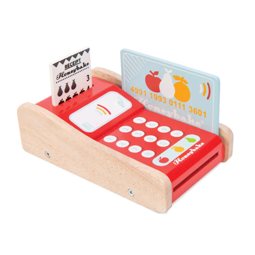 Der modern ausgestattete Kaufladen im KInderzimmer benötigt natürlich das rote Le Toy Van Kartenlesegerät, um allen kleinen und großen Kunden ein individuelles Einkaufserlebnis zu ermöglichen. Ebenso kommt es zum Einsatz, wenn Eintrittskarten für das Puppentheater oder die nächste Kinovorstellung ausgegeben werden. Eine bunte Kreditkarte sowie eine Rechnung sind im praktischen Le Toy Van Set enthalten.