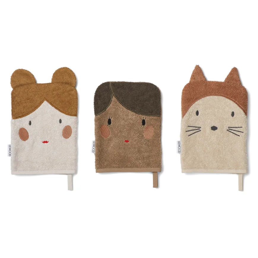 Dieses Set bietet direkt drei der tierischen Waschhandschuhe von LIEWOOD. Jeder davon ist mit einem Gesicht verziert. Zwei davon besitzen außerdem Öhrchen. Der dritte Waschhandschuh von LIEWOOD verfügt hingegen über einen Haarschopf. Dank der kleinen Schlaufen lassen sich die drei Modelle auch platzsparend an der Wand aufhängen.