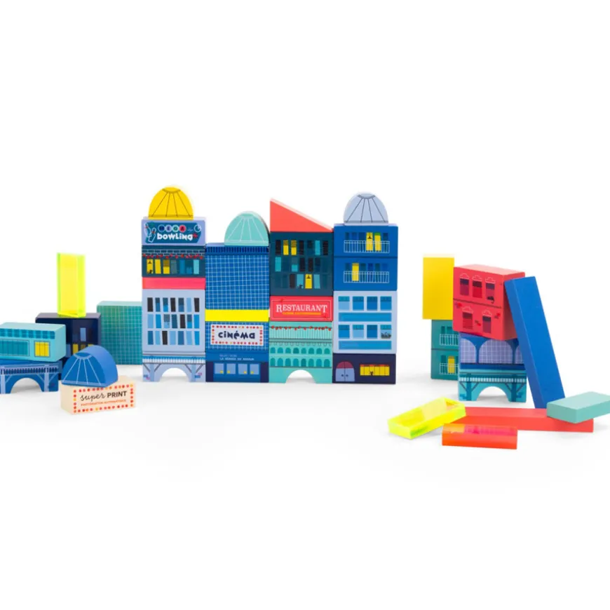 Das Blauklotz-Set von Moulin Roty begeistert mit einem ausdrucksstarken Look, der frischen Wind ins Kinderzimmer bringt. Satte Farben und tolle Illustrationen einer modernen Stadt prägen die Optik des hochwertigen Spielzeugklassikers. Mit 51 Teilen bietet das Moulin Roty Set Kindern unzählige Stapel- und Bau-Möglichkeiten.