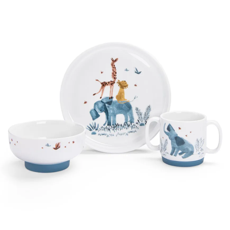 Wunderschöne Designs aus Frankreich: Moulin Roty Porzellangeschirr-Set Sous mon Baobab 3-teilig.