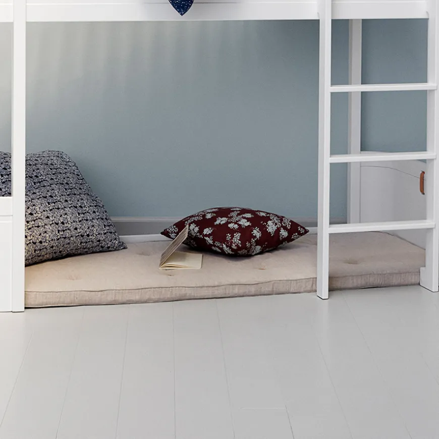 Die Spielmatratze passt perfekt in den unteren Bereich des halbhohen Hochbettes aus der Oliver Furniture Wood Mini+ Serie und verwandelt diesen in einen gemütlichen Lounge-Bereich in den sich ihr Kind zurück ziehen kann.