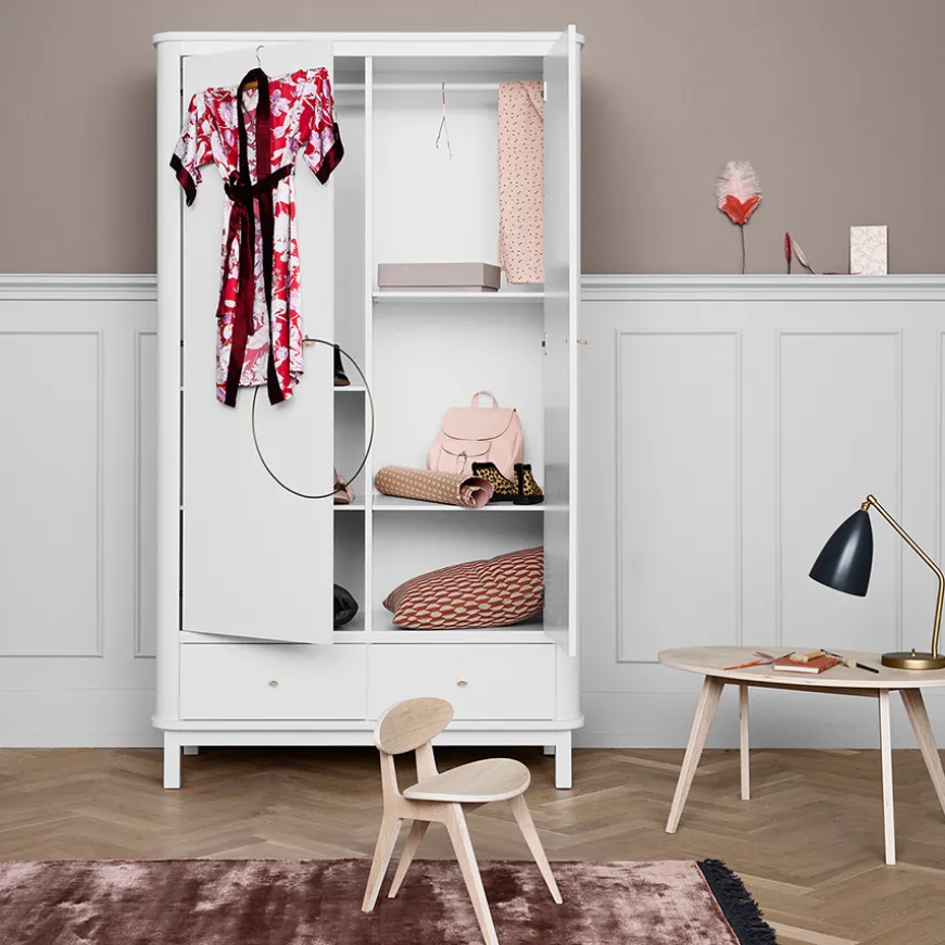 Auch bei diesem zweitürigen Kleiderschrank aus der aktuellen Kollektion setzt Oliver Furniture auf nachhaltige Qualität: bestes Birkenholz aus kontrolliertem, FSC-zertifiziertem europäischem Anbau, und darüber ein umweltfreundlicher Lack auf Wasserbasis. Die Form ist schlicht, aber dennoch innovativ durch abgerundete Kanten. Ledergriffe anstelle von Holzknäufen unterstreichen den Eindruck von skandinavischer Pragmatik, den dieser Schrank von Oliver Furniture ins Schlafzimmer bringt. An den Seiten gibt es je zwei Holzknöpfe herauszuziehen, an denen sich auf die Schnelle ein Kleiderbügel oder eine Tasche aufhängen lässt. Das Innenleben des zweitürigen Kleiderschranks von Oliver Furniture ist so vielseitig wie seine Besitzer, denn man kann Kleiderstangen und Regalböden auf unterschiedlichen Höhen anbringen.
