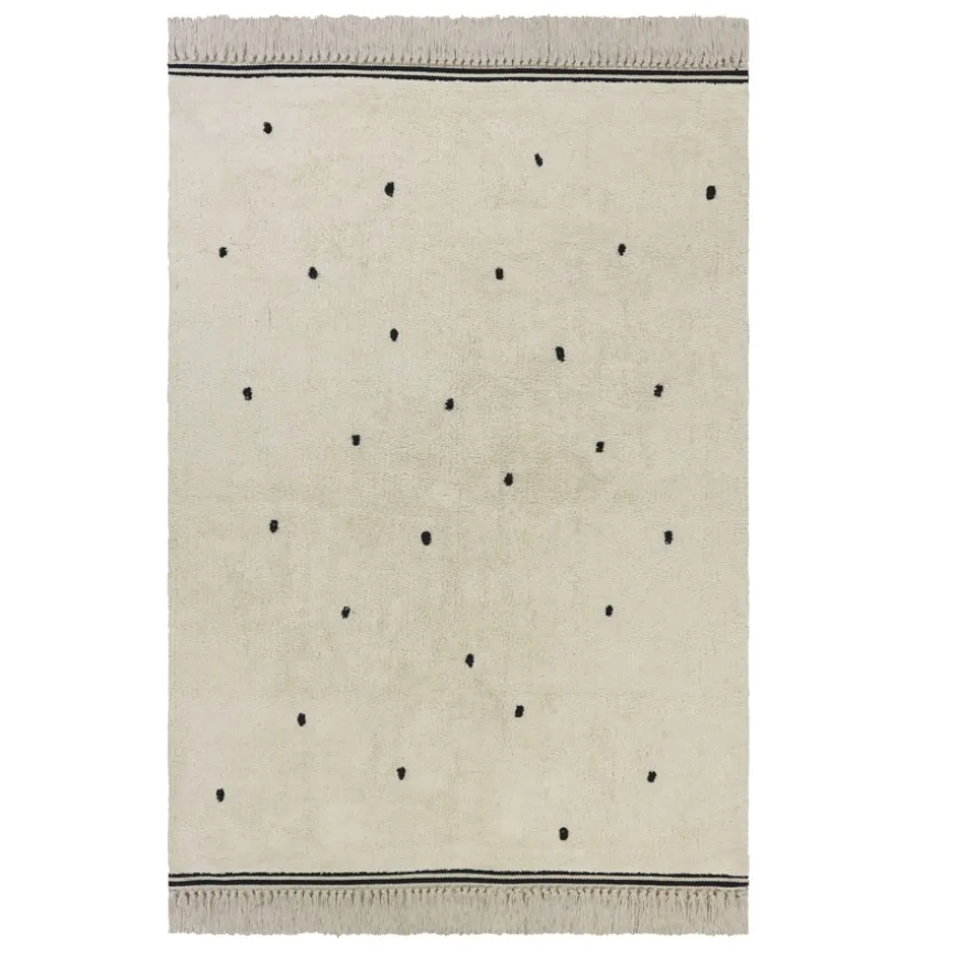 Der Tapis Petit Teppich Emily dot verzaubert in schlichtem Creme. Die Besonderheit dieser Kreation liegt in ihren zarten Punkten, die wie zufällig aufgemalt aussehen. Ergänzt wird das schöne Tapis Petit Design durch die Fransen an den Teppichenden.